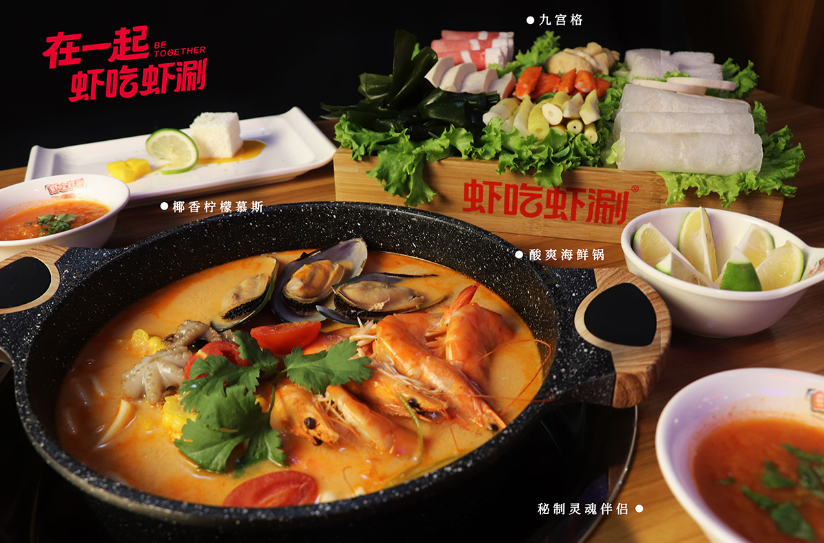 2021年的虾吃虾涮秉承每一锅虾营养又滋补入香深,留香久的产品风格,隆重推出一款可以喝汤的锅底『平平无奇酸爽海鲜锅』,新品限时限量隆重推出!一锅里的三种核心食材”白对虾/小章鱼/青口贝“让你一锅吃到爽翻天一锅过足海鲜瘾。不用奔波,在这里就可以吃到海鲜盛宴超级诱人的海鲜盛宴,应有尽有。吃一口就像潜入了海底世界,海鲜的肉嫩质感充斥着整个口腔,研发团队进行了数百次配方调整,测试,发现不开火先喝汤,让海鲜汤最浓郁的味道第一时间进入顾客的口中是食用最佳效果,再加入6滴柠檬汁,立马感受到海鲜汤的另一种风味。虾肉鲜嫩足汁,青口脆嫩爆汁,章鱼爽口弹牙,直接一口吃下去,一口虾的鲜,一口汤的酸甜,旋转,跳跃,闭着眼,回味无穷。淡淡的菠萝气息搭配锅底的海鲜味,闭上眼仿佛躺在无边的大海前,亚热带气息扑面而来~这就是灵魂伴侣啊~吃起来鲜香扑鼻,喜欢就多蘸点,味道简直绝!